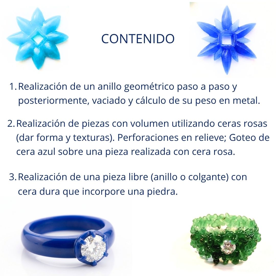 Curso especializado en el modelado de ceras en el que aprenderás varias técnicas para realizar tus propias piezas con distintos tipos de ceras y en el que además, te enseñaremos a incorporar y ajustar piedras a tus piezas.